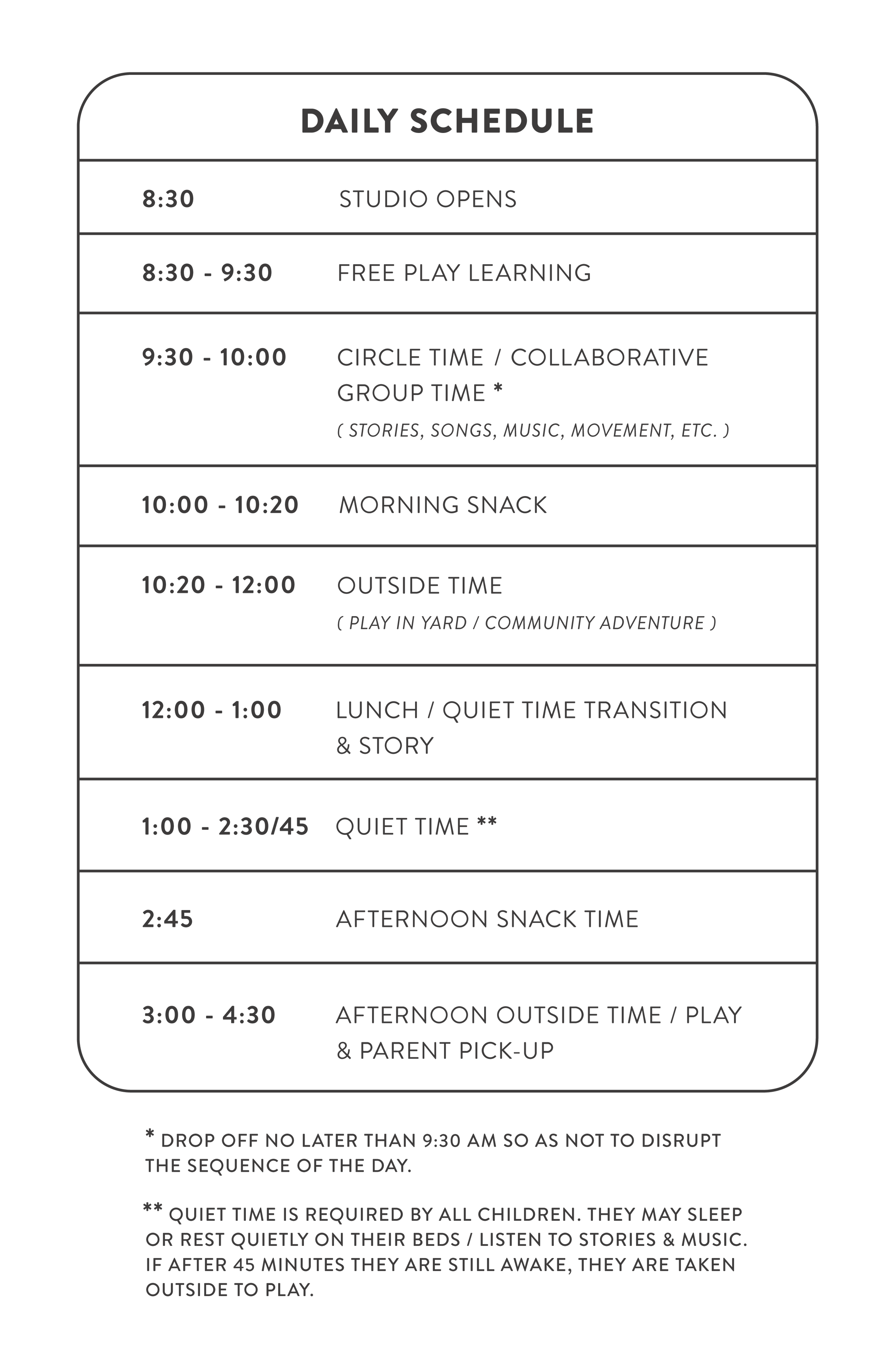 Our regular periods of outside time are noted as a minimum however, we might—depending on the day—have our circle time, snack times, or lunch outside. Our care routines are an integral part of our schedule but the timings, overall, are somewhat flexible day-to-day.
